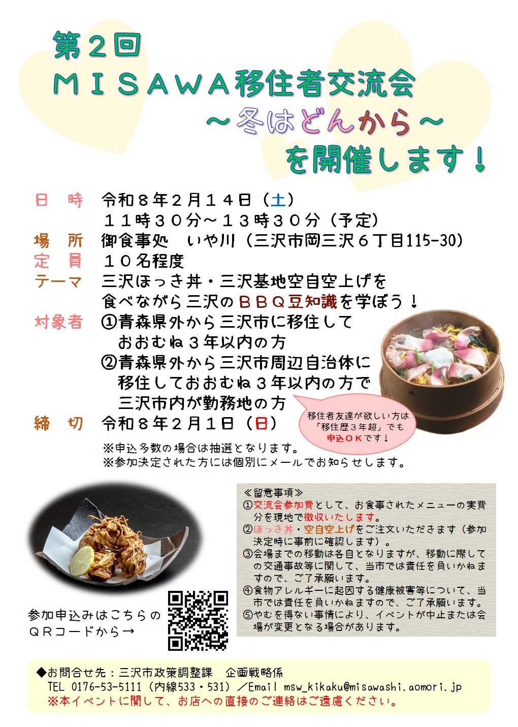 冬限定のグルメ「ほっき丼」や、航空自衛隊基地の名物「空自空上げ」を食べながら、三沢に移住された方同士が交流できるイベントを開催します♪